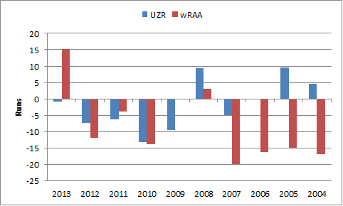 Clearly we can see that there’s no competition on the offensive side as the second base position has produced nearly 5 times the wRAA of the second best season in just over half a season (and that includes numbers from Descalso which likely brings the total down). And while there have been better defensive seasons, it’s not as if Carp has been problematic there (some of the negative in the chart is Descalso as well). While I wouldn’t expect Carp to necessarily be a plus defender at second over the long haul, even something that’s slightly below average is fine when you can get the kind of offense he’s been giving.
