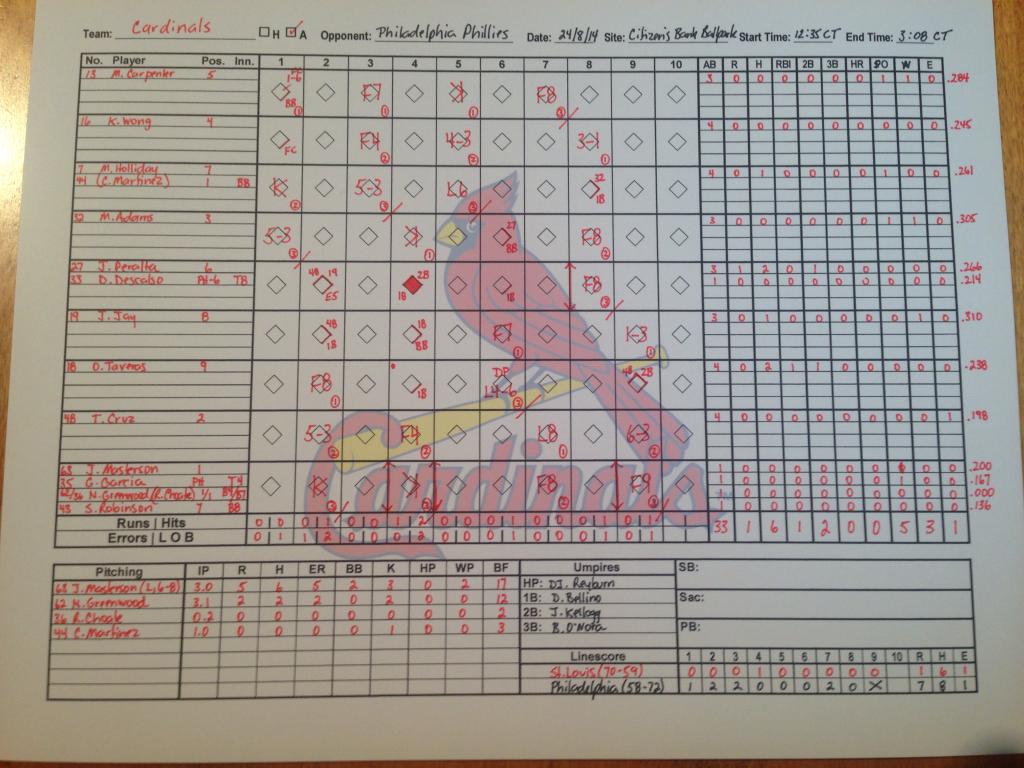 Goat: Randy Choate. It probably wasn’t that much of Choate’s fault, really. He threw a perfect seventh, but for whatever reason–and I didn’t watch this one so I don’t know what the rationale was–Mike Matheny decided to run Choate out there for another inning. I’m guessing he wanted Choate to face Chase Utley and Ryan Howard, but I think I’d have brought him in then instead of using him against the bottom of the lineup in the seventh. Choate gave up two singles and hit Howard with a pitch, leaving a bases-loaded, nobody out jam for Pat Neshek to try to clean up. Neshek got out of it without too much damage, but he was greeted by a game-tying single by Marlon Byrd. It’s hard to get out of that without something–can’t fault Neshek at all.
