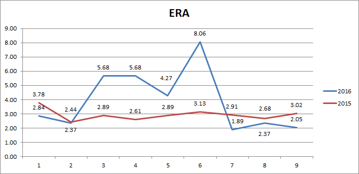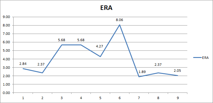 Innings 4-6, the pitcher will be through the lineup for the second to third times. Hitters are a little more familiar with what a pitchers is throwing; they are more likely to get hits after seeing more pitches. The Cardinals ERA jumps to 5.97 in the middle third of a game.