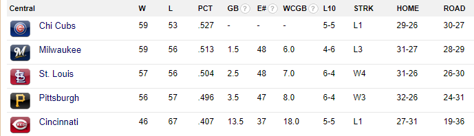 Cubs lost, Brewers lost, Rockies lost. Only Arizona, out of the teams that the Cardinals should keep some eye on, was able to pull out a victory last night. I’m still not really convinced the wild card is a legitimate option for this team, but it’s worth paying a little attention. The division is the bigger deal, of course, and that right now seems doable. Right now those seven games with the Cubs in September, four of which are in Busch, are pointed toward drama and meaning something. Whether that’ll be the case by the end of the month, we’ll have to wait and see, but the fact that we can look at those and realistically think about the division being won or lost there is amazing given where this club has been.