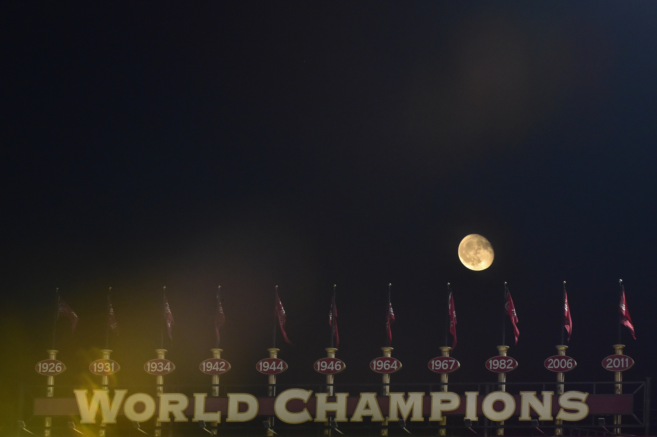 Sep 16, 2019; St. Louis, MO, USA; The moon rises over the St. Louis Cardinals World Series Champions flags after a game against the Washington Nationals at Busch Stadium. Mandatory Credit: Jeff Curry-USA TODAY Sports