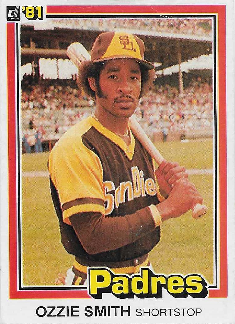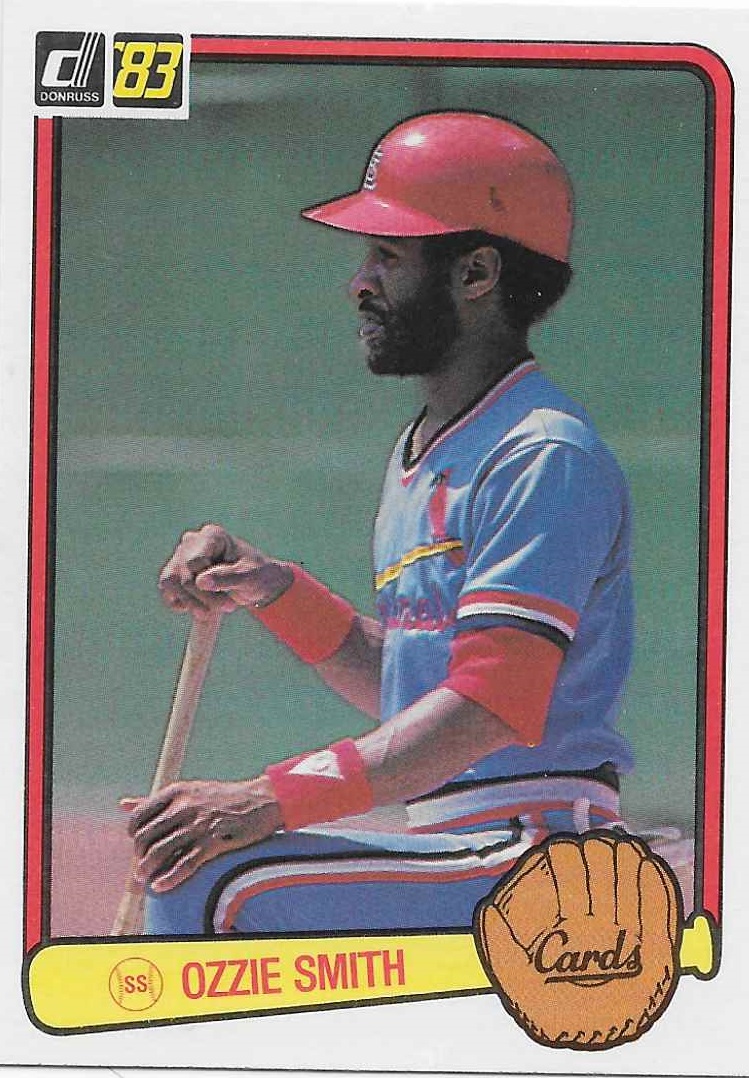 Donruss started making baseball cards in 1981, so these are the oldest Ozzie Smith Donruss ones there are. There’s something appealing about the simplicity, especially with the ’82 using a bat and a ball for the team and player name. The same went for ’83, when the ball became a glove (and moved to the other side of the bat). That was Ozzie’s first Cardinal Donruss card, because I don’t believe Donruss went for the traded/rookies set that came out later in the year like Fleer and Topps did.